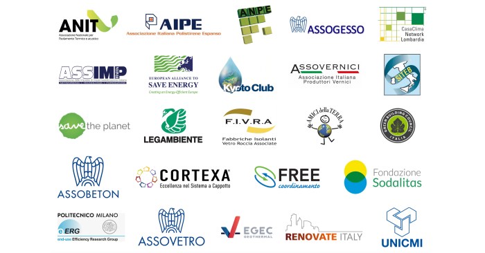 AIPE – Associazione Italiana Polistirene Espanso | AMICI DELLA TERRA | ANIT – Associazione Nazionale Isolamento Termico e Acustico | ANPE – Associazione Nazionale Poliuretano Espanso Rigido | ASSIMP ITALIA – Associazione delle Imprese di Impermeabilizzazione Italiane | ASSOBETON – Associazione Nazionale Industrie Manufatti Cementizi | ASSOGESSO – Associazione dei Produttori Italiani di Gesso | ASSOVERNICI – Associazione Italiana Produttori Vernici | ASSOVETRO – Associazione Nazionale degli Industriali del Vetro | CASACLIMA NETWORK LOMBARDIA | COORDINAMENTO FREE – Coordinamento Fonti Rinnovabili ed Efficienza Energetica | CORTEXA – Eccellenza nel Sistema a Cappotto | eERG – end-use Efficiency Research Group del Politecnico di Milano | EGEC – European Geothermal Energy Council | EU-ASE – European Alliance to Save Energy | FIVRA – Fabbriche Isolanti Vetro Roccia Associate | FONDAZIONE SODALITAS | GBC ITALIA – Green Building Council Italia | KYOTO CLUB | LEGAMBIENTE | RENOVATE ITALY | SAVE THE PLANET ONLUS | SITEB – Strade Italiane e Bitumi | UNICMI – Unione Nazionale delle Industrie delle Costruzioni Metalliche dell’Involucro e dei serramenti