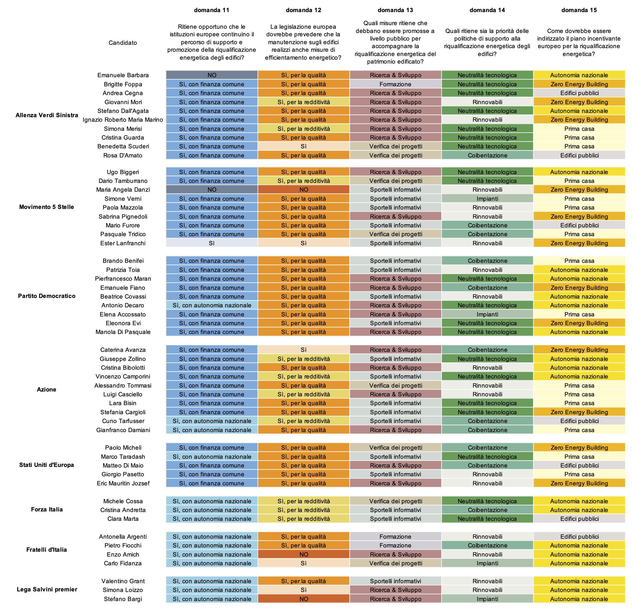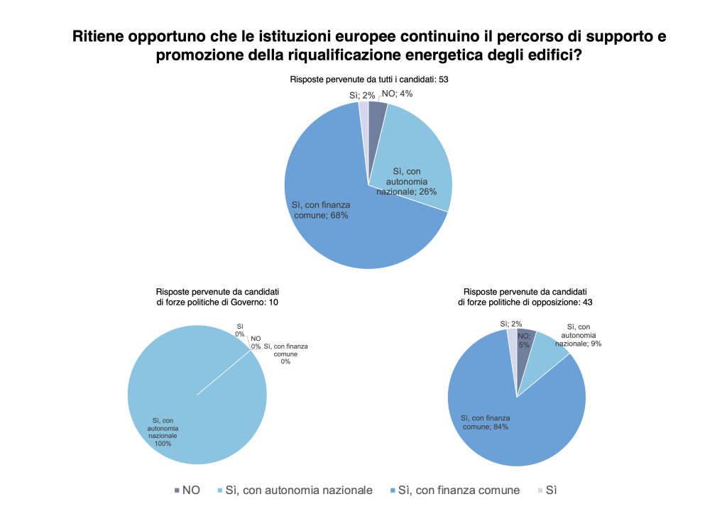 Pressoché tutti i candidati (51 scelte su 53 risposte alla domanda n. 11) ritengono opportuno che le istituzioni europee continuino a supportare e promuovere la riqualificazione energetica degli edifici.