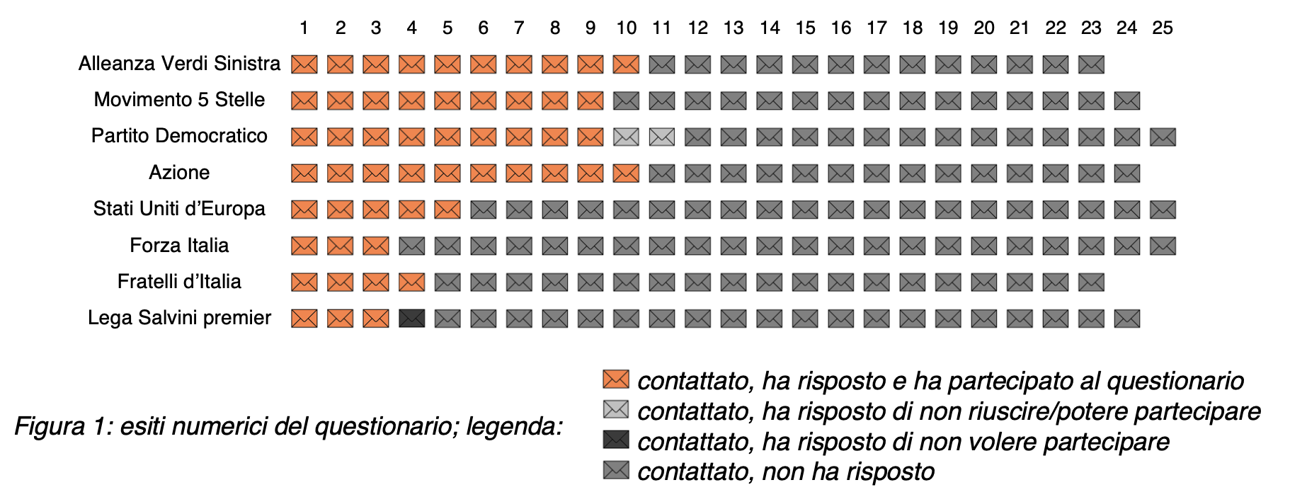 Abbiamo contattato più di 20 candidati di ogni forza politica, distribuiti nelle 5 circoscrizioni, invitandoli a rispondere al questionario, tramite via mail o via social network; l’invito è stato ripetuto ogni 3 giorni durante 3 settimane, fino all’ottenimento della risposta. In totale sono stati contattati 193 candidati, 53 dei quali hanno risposto, come mostra la Figura 1.