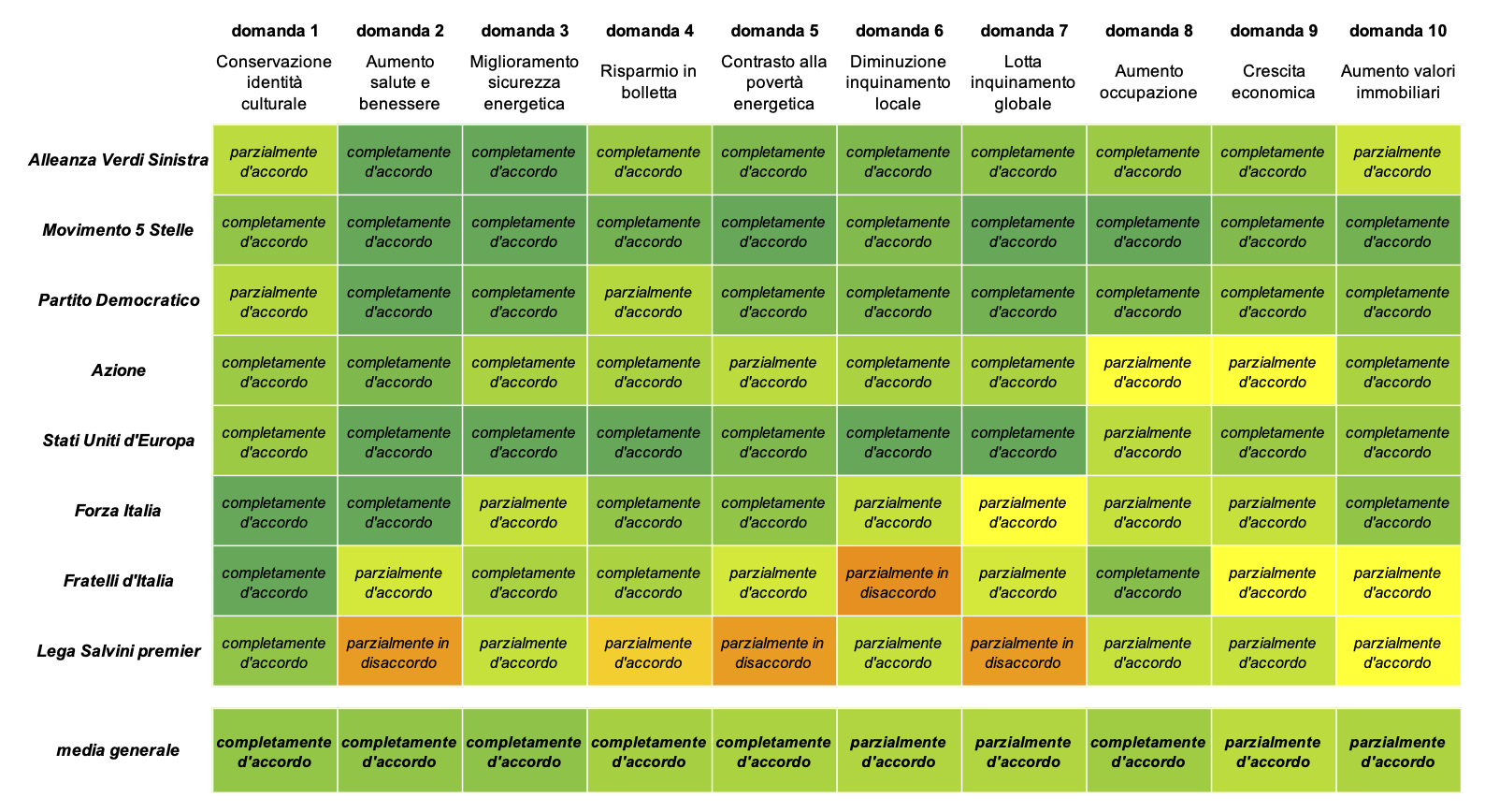 Con queste premesse, non stupisce che i risultati generali (ottenuti mediando le risposte ricevute da ogni forza politica), indichino la percezione di un forte legame tra le riqualificazioni edilizie e tutti i dieci benefici (infatti tutte le celle nella riga “media generale” della Figura 2, riportano “completamente d’accordo” o “parzialmente d’accordo”).