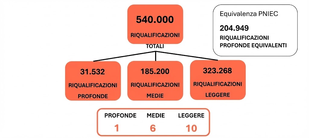 Il Piano spagnolo prevede che la de-carbonizzazione si otterrà anche grazie alla de-carbonizzazione del sistema energetico, ma il risultato verrà raggiunto soprattutto grazie alle riqualificazioni degli edifici; su questo aspetto, il Piano spagnolo in modo intelligente differenzia tra riqualificazione leggere, medie e profonde, con interessanti riflessioni.