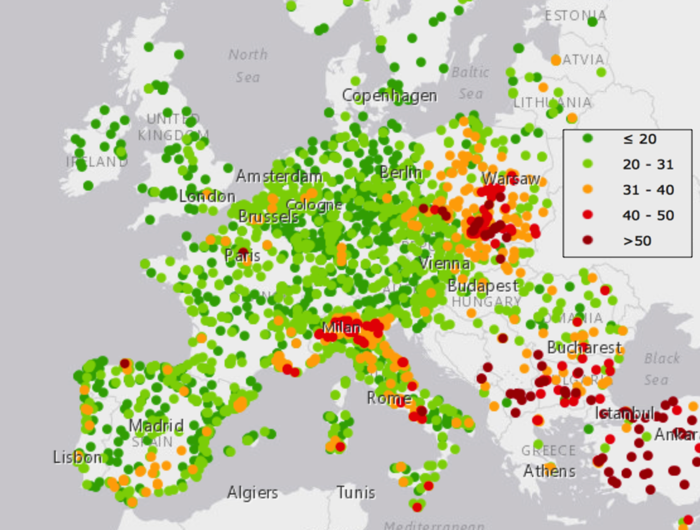 Figura 3: mappa della concentrazione media annuale del PM10, dati in μg/m3 (fonte: European Environment Agency, 2012).